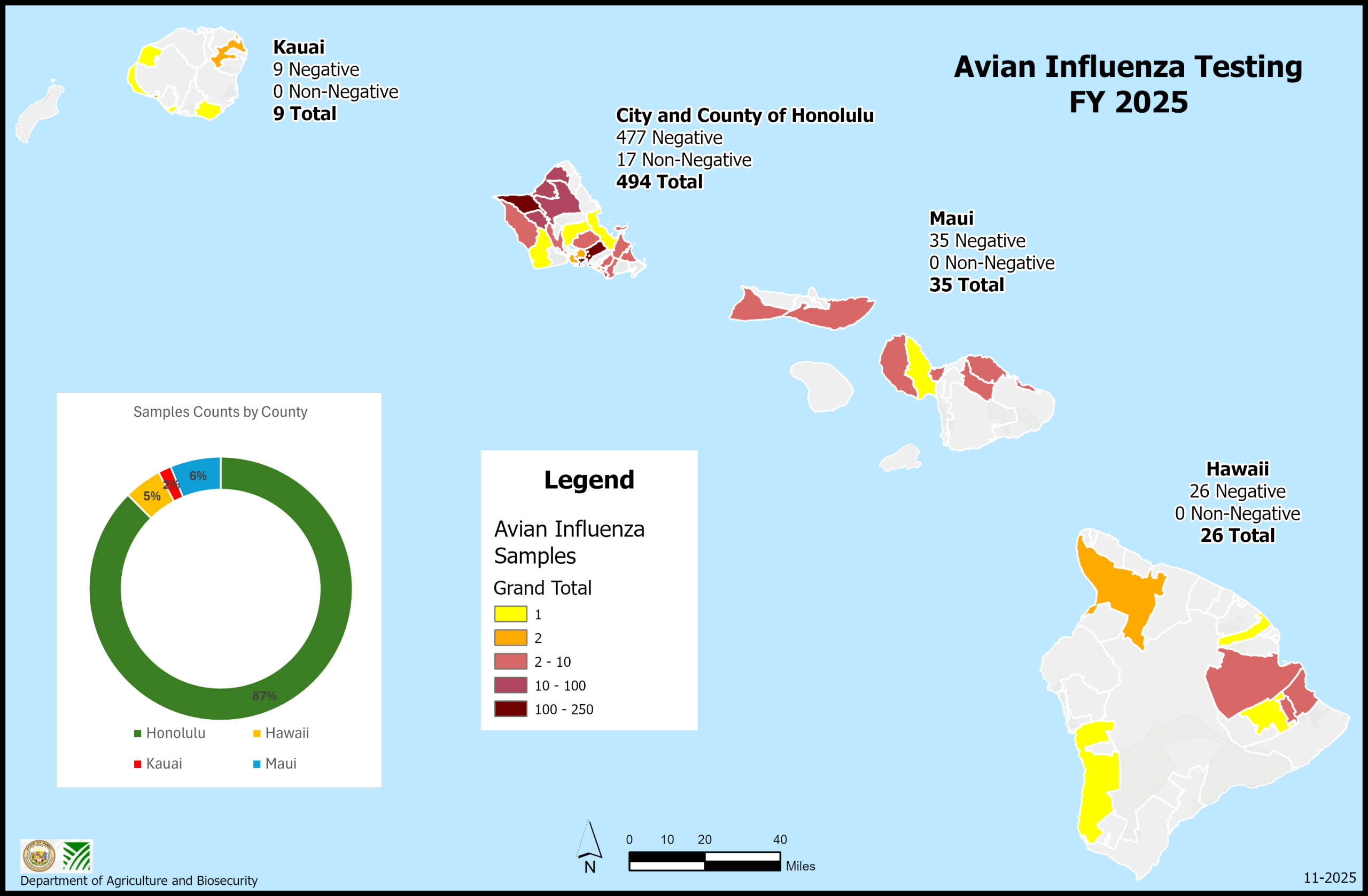 During FY 2025, the Animal Industry Division tested samples collected statewide for avian influenza. Division veterinarians continue to monitor the situation through case assessment and sample testing.