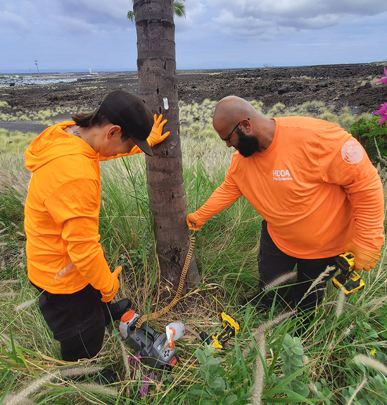 – Collect any suspected CRB and report findings or visible damage to HDAB at (808) 643-PEST (7378) or the Big Island Invasive Species Committee (BIISC) at (808) 933-3340.